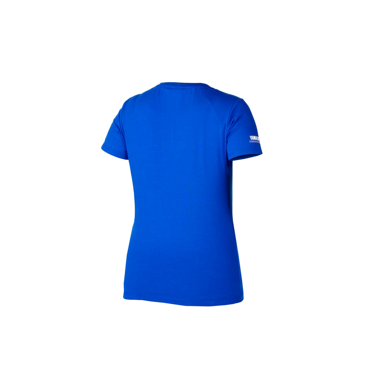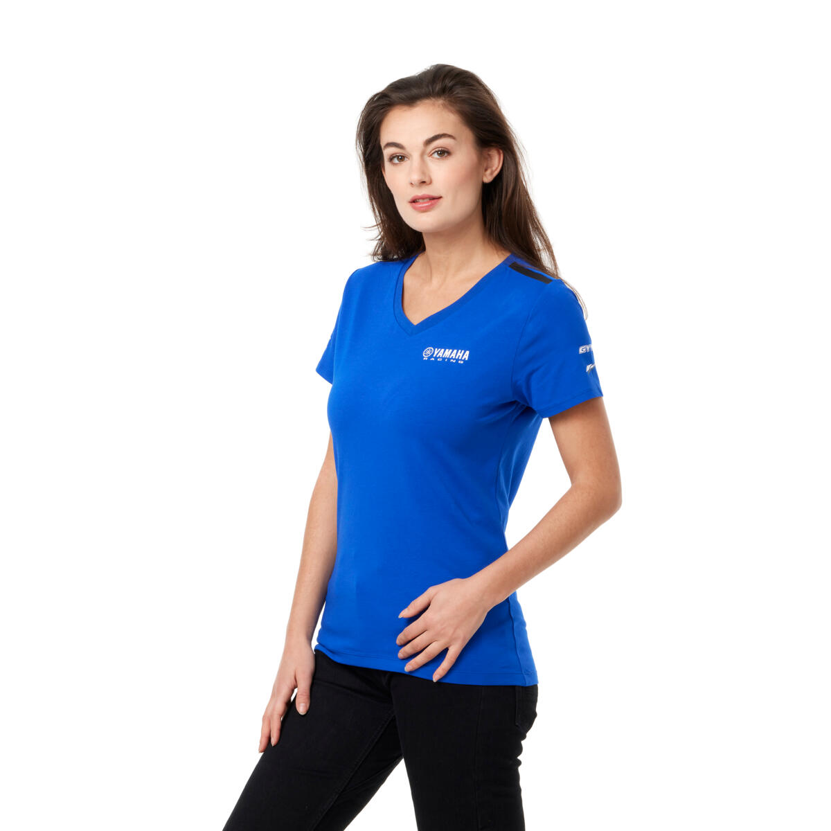 T-shirt Paddock Blue confortável para senhora com logótipos da Yamaha Racing no peito e nas mangas. A t-shirt de malha macia apresenta vários elementos de design pretos e brancos.